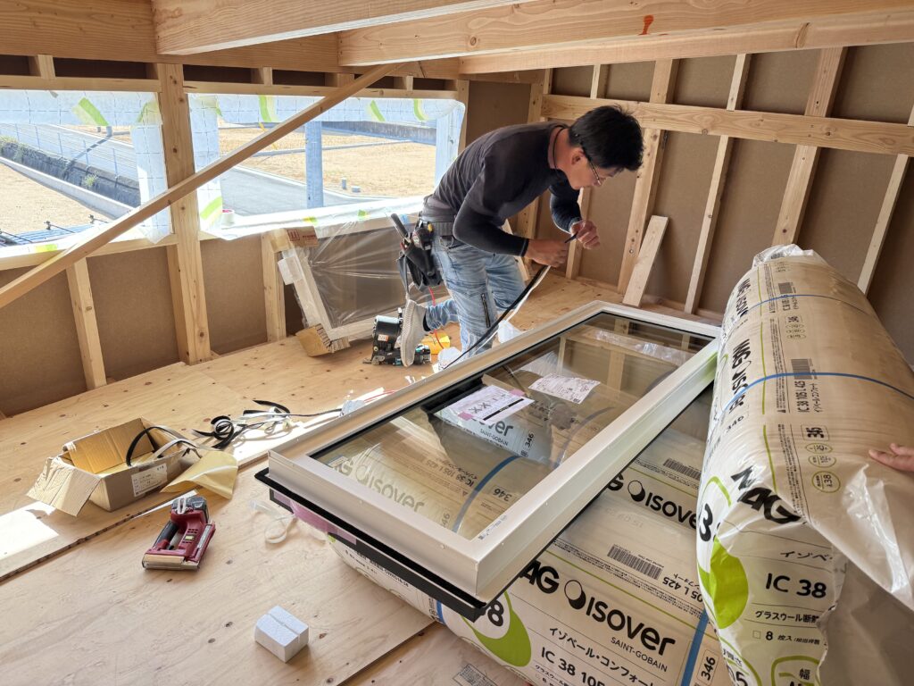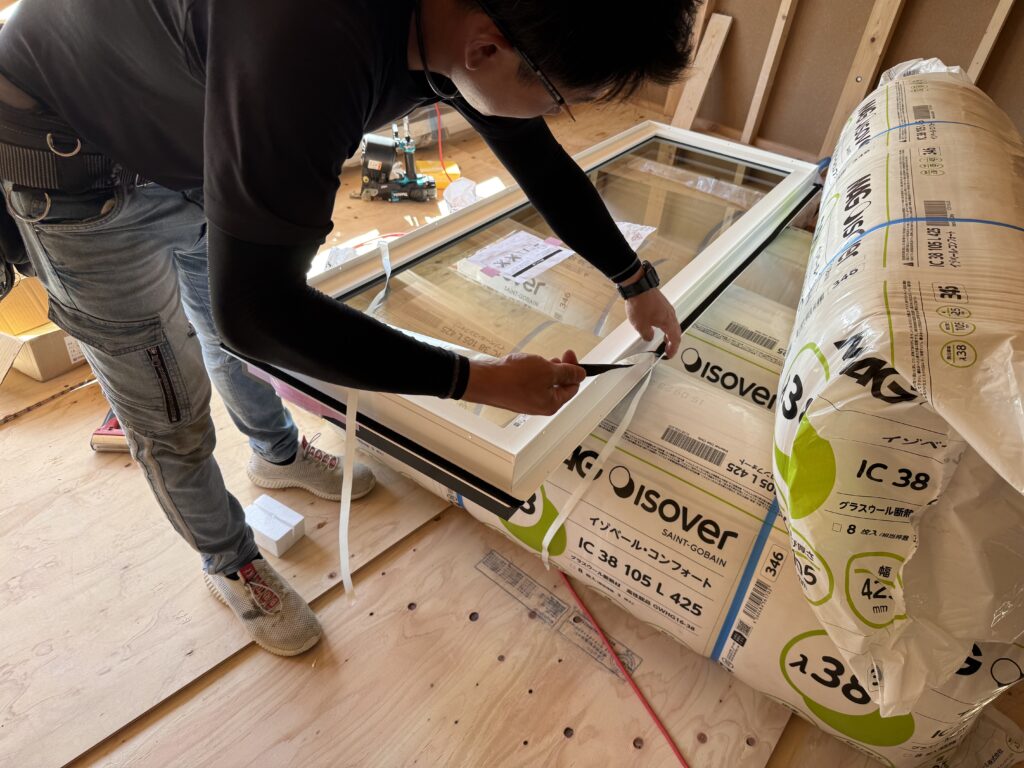 現場ではトリプルガラス樹脂サッシの取り付け作業中でした。