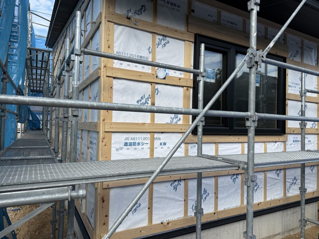 外部は付加断熱の工事が終わり、通気胴縁を施工しています。