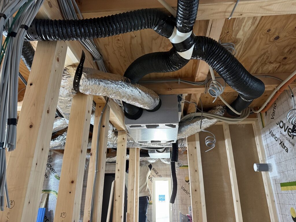 処理箇所の多い床断熱の上、気密性のあまりよくない引違窓が6窓ある建物でこれだけの施工度を確保してくれた、大工さんと現場スタッフに感謝です。