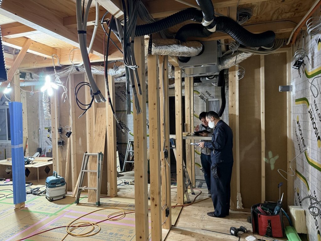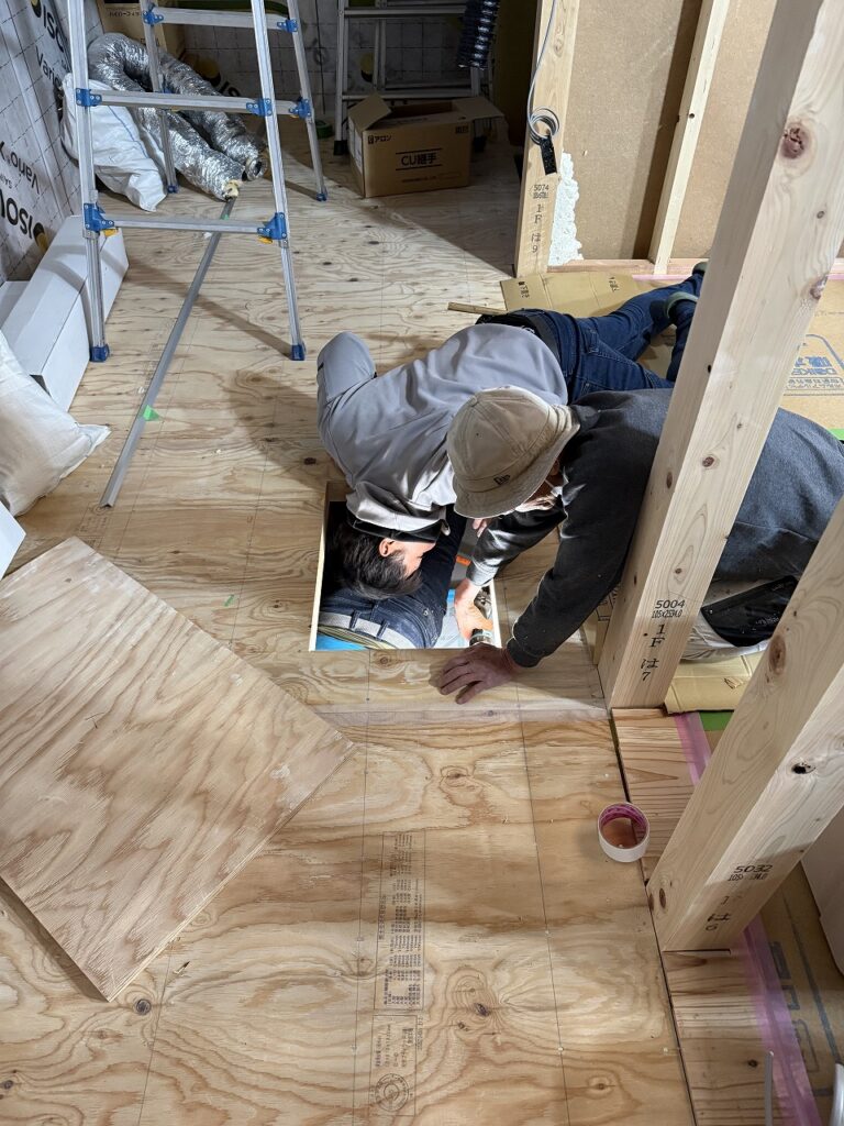 この建物は床断熱なのですが、水廻りは基礎断熱になっているので、床下に潜って漏気個所がないか確認していきます。