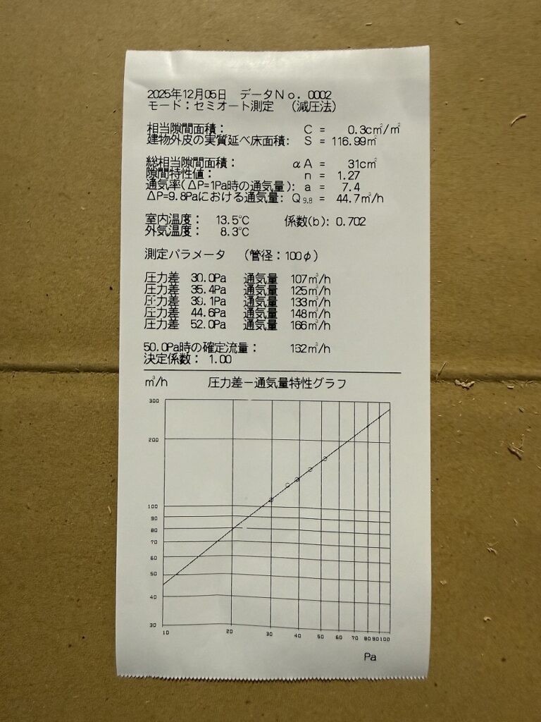 結果はC値=0.3(0.26)cm2/m2という素晴らしい結果でした。