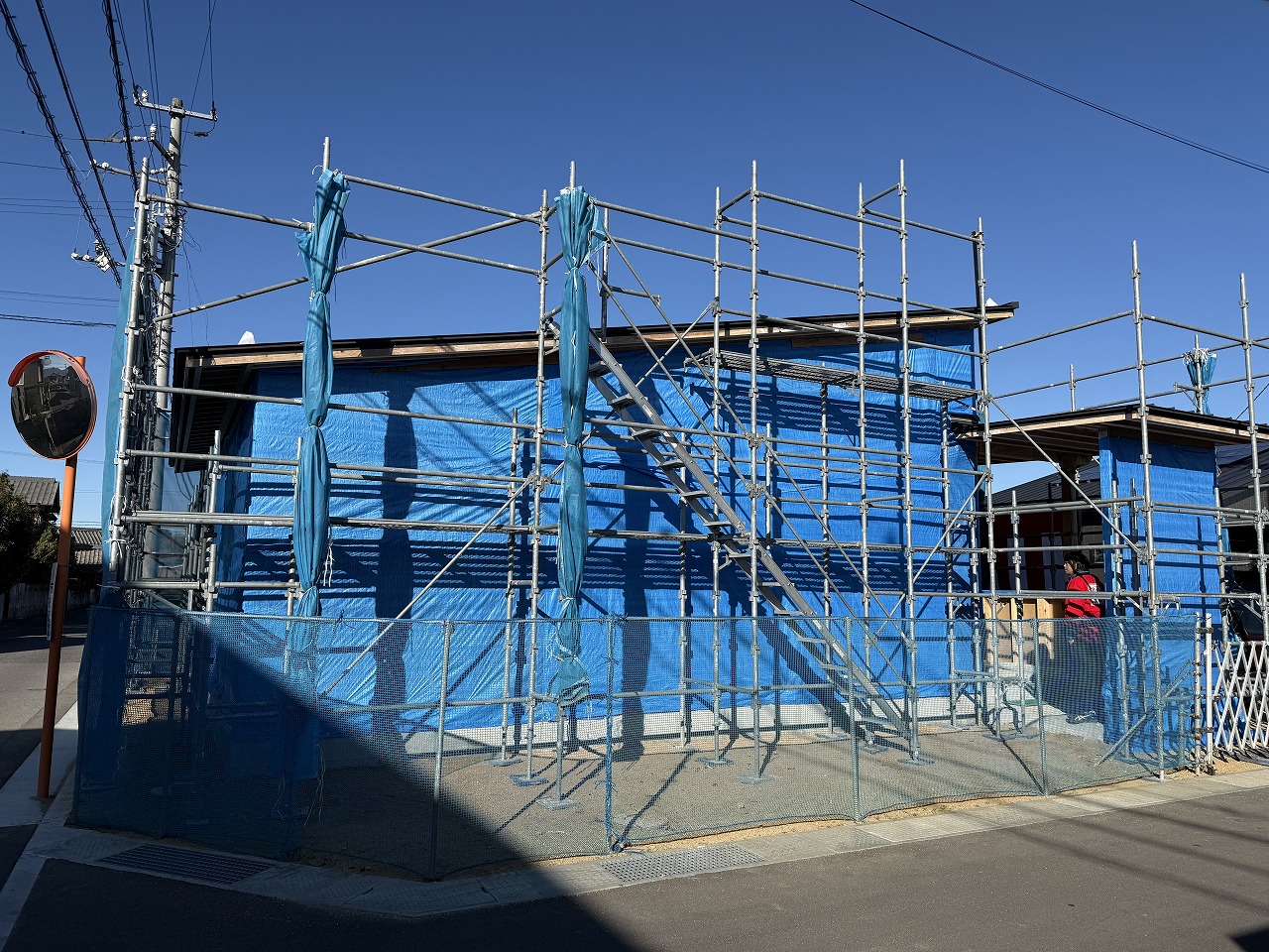 年末に上棟しましたが、壁の防水が終わっていないので、防水工事が終わるまではブルーシートでしっかり養生しています。