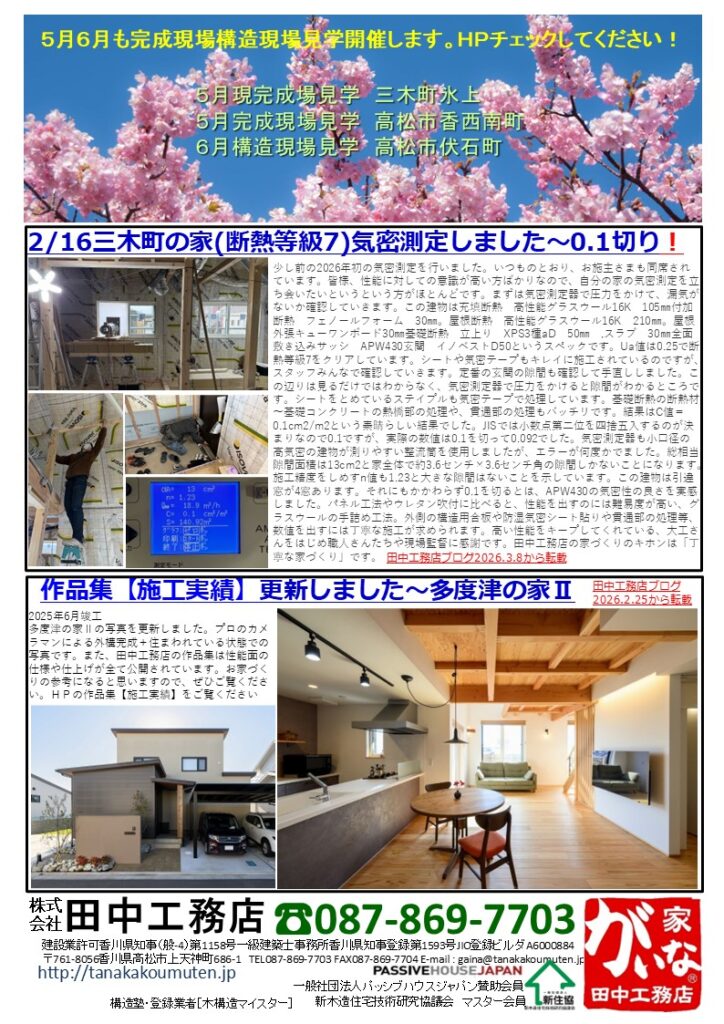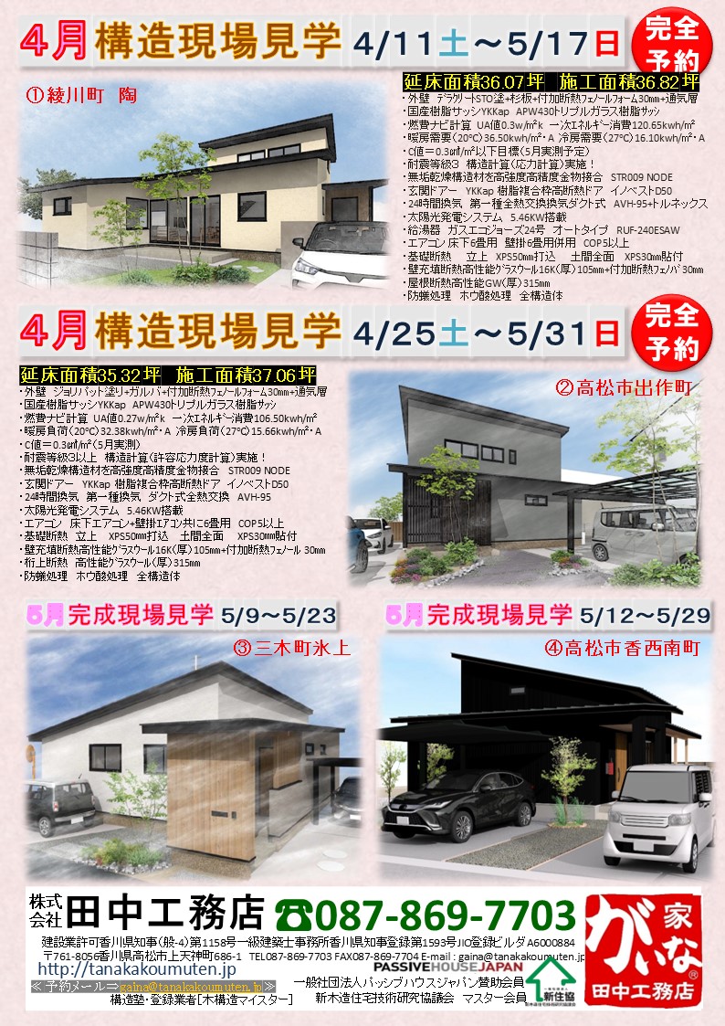 2026.4.4 ニュース 4月、5月のイベント案内 4月、5月のがいな家イベント案内です。4月は綾川町と高松市で構造をご見学いただくことができます。 どちらも高性能な住宅です。完成前の構造をぜひこの機会にご覧ください。